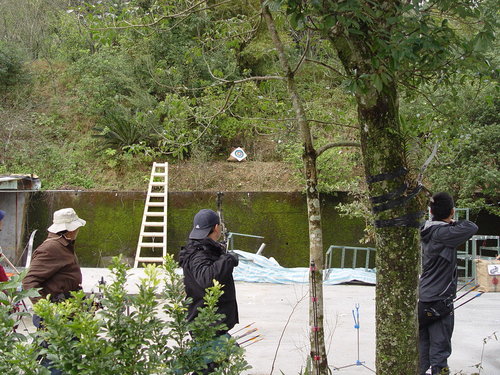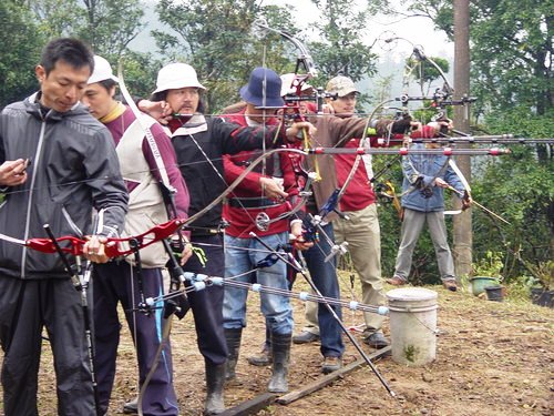 99.12.26功夫射箭隊的年終聚會,地點來到了『坪林往闊瀨』方向的山區,一早在坪林交流道集合時,天氣大約6~8度且飄著細雨,大家都想說今天我們這群〝射箭瘋子〞大概要變落湯雞了>_<,從坪林交流道一路〝九彎十八拐〞的殺到了目的地『北42 19.5K』原野射箭秘密基地由邱大哥的連襟兄提供《台語的話是(大小顯仔)》,一群人已經繞到暈頭轉向,所以一下車大家就是先場勘環境,呼吸一下冰冷的新鮮空氣,清醒一下頭腦!!