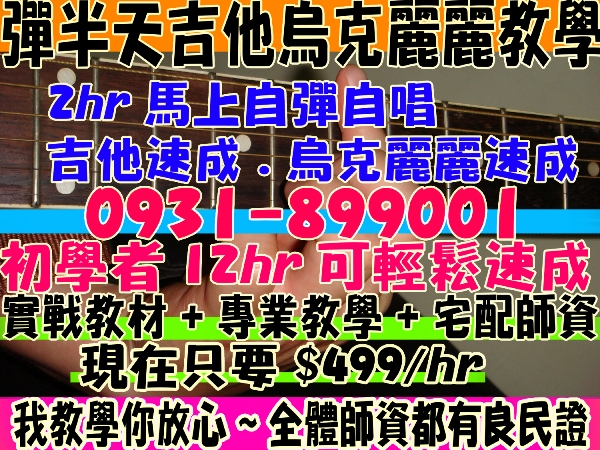 指法教學+刷法教學+唱法教學+間奏SOLO教學+彈半天音樂流行教材+宅配到府授課=才花$499/hr??太扯了!!比樂器行比YAMAHA更便宜更低價更貼心~居然~還宅配師資到府?少看兩場電影馬上擁有吉他烏克麗麗彈唱才藝~真的太便宜了!!馬上報名請洽0987-923061~學不會不收錢喔!!