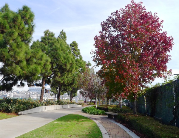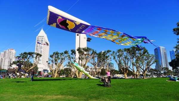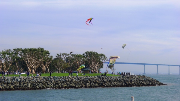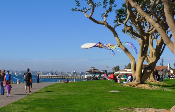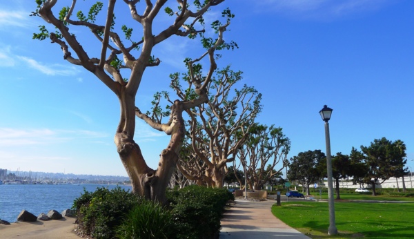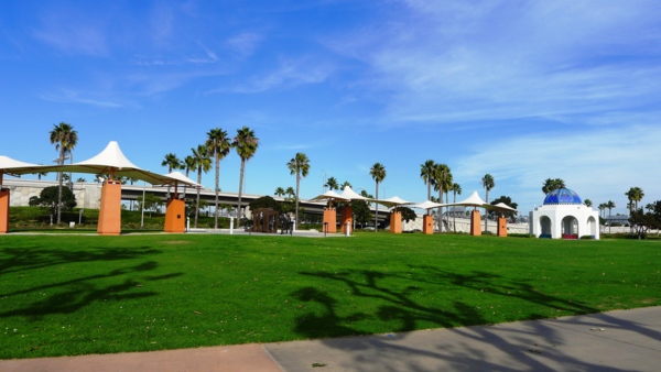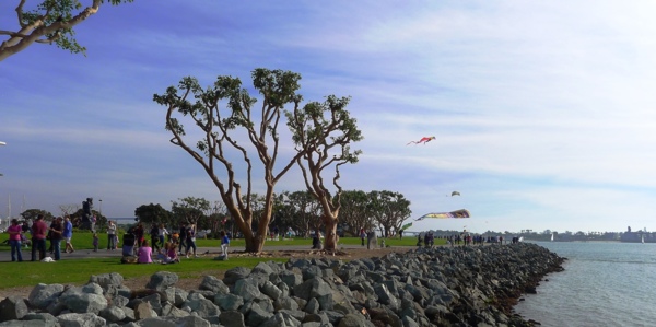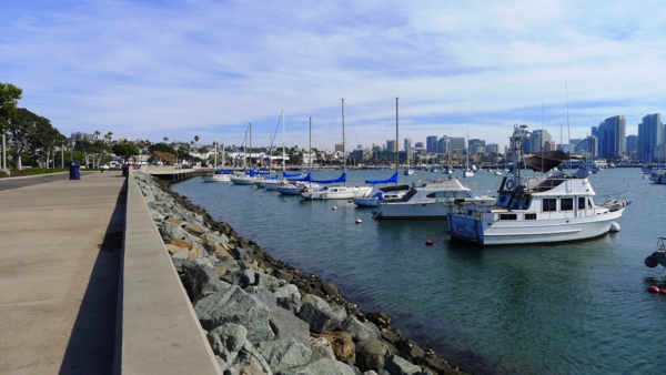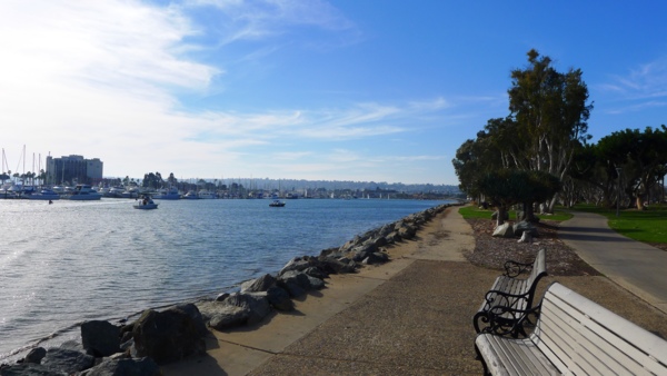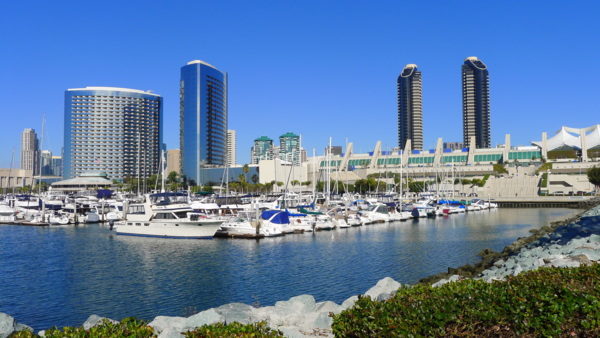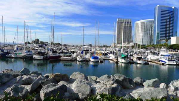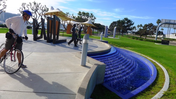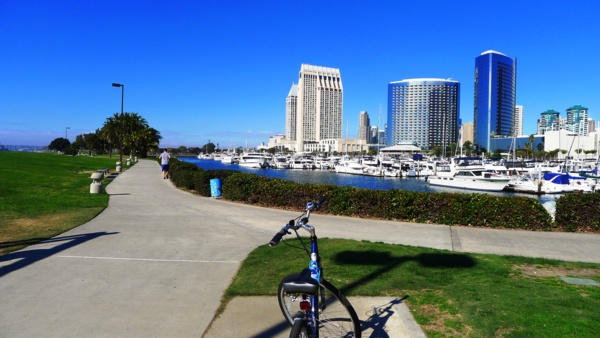 只 要天氣清朗,所有的港灣看起來都是很美的。聖地牙哥灣也不例外,尤其這𥚃綠樹成茵,草坪翠綠,每年聖地牙哥夏日戶外音樂會San Diego Pop就在這兒舉辦。白船靠港,水天一色藍上加藍,背後的摩天高樓輝映出港灣的現代都會氣派,這個灣是南加卅第一大灣,又稱為大灣,因是熱門旅遊渡假區, 規劃得整潔有序,景區分佈在不同處,分散開了人潮。某些人潮區禁騎腳踏車進入,只能用牽的穿越。