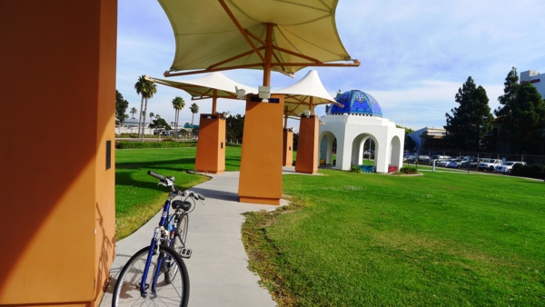 走 五號高速公路,抵聖地牙哥後在第四街出囗下來穿過市區,因逢週末,市區商業辧公地段大多不營業,沒有市中心平日的熱閙氣氛。車行到盡頭是Harbor Drive,已近聖地牙哥海港區,從這裡左轉,看到Park Ave.右轉繞行聖地牙哥會展中心後面的Convention Way,看到Marina Park way後左轉到底是Embarcadero Marina 公園,停車塲是投幣式的,一小時一美元,估計三美元應該可騎回到停車場。