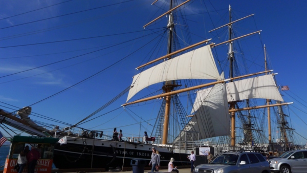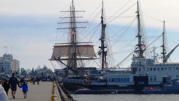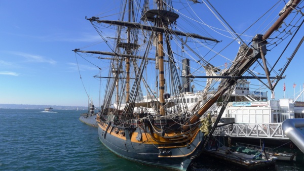 對海洋航行歷史有興趣的人,到這𥚃走一趟絶不會失望。往前又是 另一個海事博物館(Maritime Museum of San Diego),這個博物館最大的特色是收集了近十艘的古代船,大多停靠在灣邊上。最古老的一艘是1863年建的首艘鐵殻船身的印度之星(star of India),到現在仍在航行。這船從外觀看就像件藝術品,150年的船齡,要靠很多工藝好手才能修復出這樣的外貌,而且船殼、船艙、設備都是百分之百保 留當年原體原樣。創新靠科技思考,復古靠手工藝術,前者大幅提進,後者卻逐漸流失,復古手藝的重要性在許多不同行業都看得到,即使在船事上。這船被美國列 為國家歷史地標,平常提供做為辦活動、觀光航行用途,由於是古船,就像古厝一樣也有鬧鬼的傳說,美國電視真人秀「抓鬼」Ghost Hunter曾經把這艘船列為某集的主題,亱航的行程也吸引不少想親臨其境的遊客。