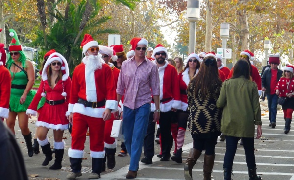 這段人行步道因靠近渡船口,有不少人正排隊等船搭到對岸,有些擁擠。一羣 身著聖誕老人紅服的報佳音男女置身人羣中,特別紅挑喜氣,增添了不少過節的氣氛。
