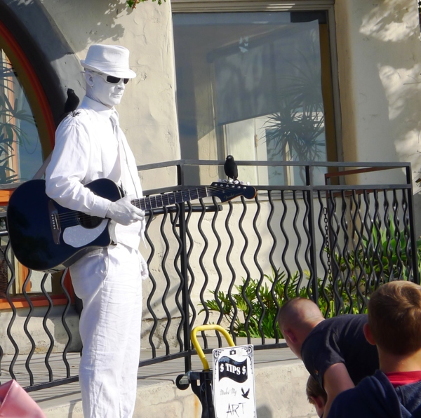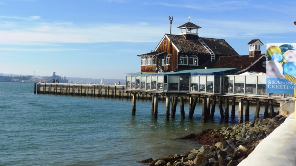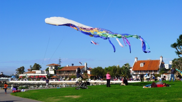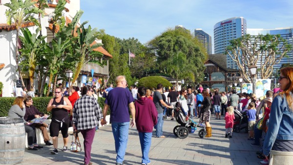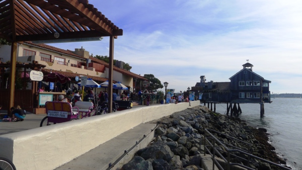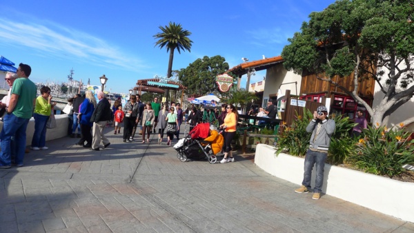 與 公園連接的Seaport Village 是聖地牙哥最有名的購物中心,這是個戶外商街,大概有七十多家店在裡面,都很精緻小巧,每家店的建築裝飾各有特色,戶外有水池噴泉造園,也是休閒散步的好地方。沿灣的步道旁有不少餐廳,提供了絕佳的景色。不過,今天步道上過往的人不少,只能人看人。這段步道有街頭藝術家表演,也是逛街人潮的集中地,禁行自 行車進入,不過下車步行也不錯,看看街頭的表演,慢慢欣賞灣景。