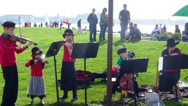循原路往回騎,午餐過後的另一波人潮又聚集在Sea Point Village,那個艶麗的大風箏仍在那𥚃飄啊飄的招攬過路人的眼光。街頭表演者也利用這個黃金時段賣力秀自己的才華,全身抹白的真人雕像動也不動立在 路邊,感覺好像連呼吸也停止了。有一個四人組的兒童室內樂團演奏聖誕音樂,光是造型及可愛的模樣就夠吸引人了。這個地方的街頭表演是有點名氣的,尤其每年 三月底有個名為Busker街頭表演的藝術節在這𥚃舉辦,吸引全球各地上百個街頭藝術表演團隊參加選拔,期盼能獲得演出機會,今年獲選的團體在三月二十 九、三十兩整天將在此演出。
