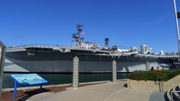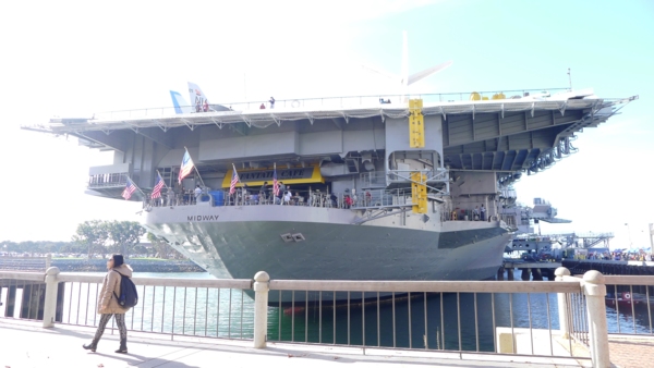旁邊停泊的是中途島號航空母艦,這艦艇歷經47年征戰後在 2004年停靠聖地牙哥灣,開放做為博物館,是聖地牙哥最重要的旅遊參訪項目。這艘巨型艦艇有三個足球塲大、二十層樓高,當年出任務時,每天要準備一萬三 千份的餐點供艦上4500名官兵食用。對這種軍事景點沒興趣的人,據悉進到裡面參觀後都留連忘返,尤其解說員多是退役水手,專業知識豐富,更增加了遊客的 興緻。入內走一趟門票一人20美元,至少要花半天的時間才能遊完,這趟主要是來騎車,等待下次再好好到𥚃面參觀,體驗美國海軍的海上生活。艦上的甲板上 有個供遊客用餐的咖啡館坐了不少人,遊客坐在那𥚃居高臨下,望向聖地牙哥市區。