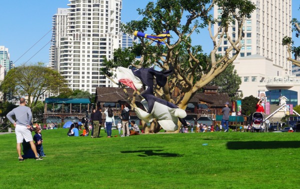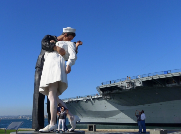 往前行是另 一組25英呎高的巨型銅像「水手之吻」,這個取材自生活雜誌家喻戶曉攝影作品的戶外創作,捕捉了二次大戰剛結束的快樂氣氛。雖然有地方人士與藝術界質疑這 尊作品的藝術價值與品味,但放眼望去聖地牙哥灣的休閒與浪漫氣氛,這件作品完全沒有不協調之感,反而有畫龍點睛的效果,想像夕陽西下的餘暉從背後映照時, 應更是浪漫。有趣的是,這件作品是透過一個名為「保留親吻」(Saving the Kiss)的募款活動,在短短期間募得所需的經費,不過這擎天一吻真的是有點高「貴」,雖不是花納稅人的錢,但一共花了一百萬美元的捐款才促成。不過這水 手高高在上,並不在乎腳下世界的存在,任由底下渺小遊客的窺視、合照或cosplay。