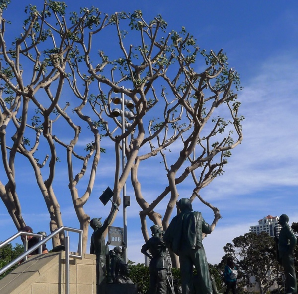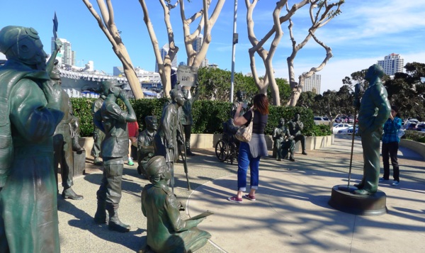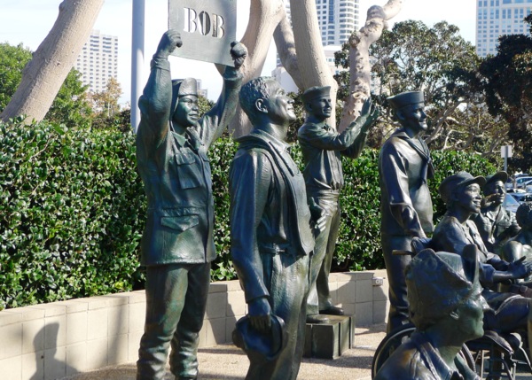 由於早期是美國太平洋海軍艦艇的基地與總部,由其衍生出的相關紀念設施與展示,是這𥚃最主要的旅遊熱點。在Harbor Blvd 與G street的交會處,是向Bob Hope 致敬的一組實體大小的十六個銅像雕塑,其中十五個代表來自不同軍種的男女士兵,另一個是Bob Hope面向這組軍人,為他們勞軍獻唱的模樣。Bob Hope演唱錄音的歌聲也同時在現場播放。陳列在刺桐樹下的這組軍人銅像,有坐輪椅的,也有失去一條腿的,每一個人的表情都是栩栩如生,欣喜的觀看Bob Hope的表演。到此一遊的人,忙著穿梭在這十六銅人陣仗中拍照。置身戰爭中最可貴的是不忘生活中的幽默與歡笑,Bob Hope就如他的姓一樣,勞軍所到之處,帶給美國軍人希望與歡樂,這組公共藝術品以廣濶的陽光大海為背景,更突顯了這個正面的人生觀。