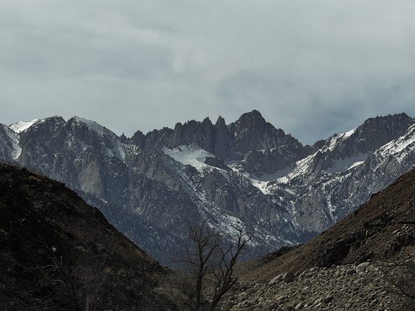 一路上都是華氏68度左右的入春氣候,看到East Sierra山脊白雪撲面,才感覺冬天節氣的存在。Mt. Whitney的黑色尖錐高挺而出,嚴峻又神秘,帶給人無限的聯想。冬季路段封閉,車子無法直抵登山囗Whitney Portal,柵欄外仍停著幾部車,車主可能正深入這座美國本土48卅最高峯,體驗高山冰雪魔幻。10月至4月申請入山証無需等候抽簽,上網就可拿到,但登山難度及所需裝備相對增加,攀登者通常都是有高山攀登(Alpine Climbing)經驗或高山嚮導帶路。