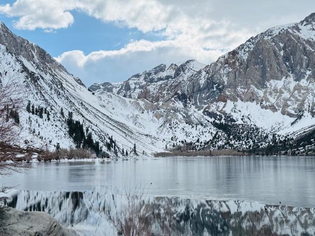 下了山繞行至Convict Lake,這個湖從395公路進出便捷,設有環湖步道及登山路線。面湖的是12241英呎高的Mount Morrison,氣候晴朗時,山脊在清澈湖面映出倒影,隨著陽光明喑改變色澤,有如魔幻明鏡。冬天傍晚天寒已不見人車,湖面蒙上薄冰,映出底層寶藍湖水。湖緣未結冰則如破碎鏡面,映照山脊倒影,真是大自然的鬼斧神工。