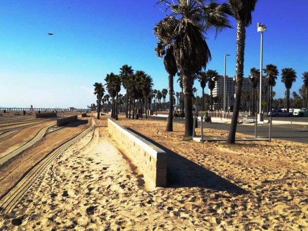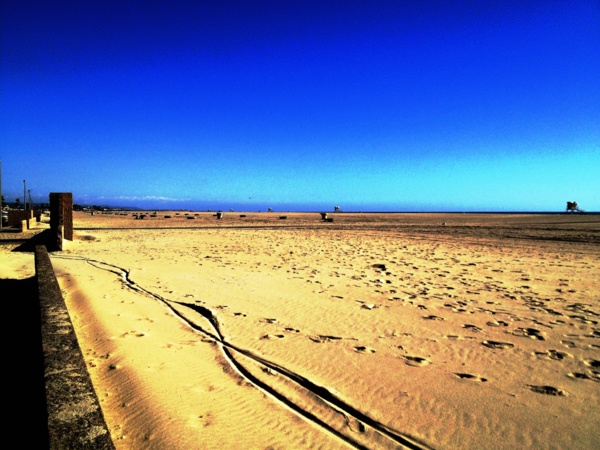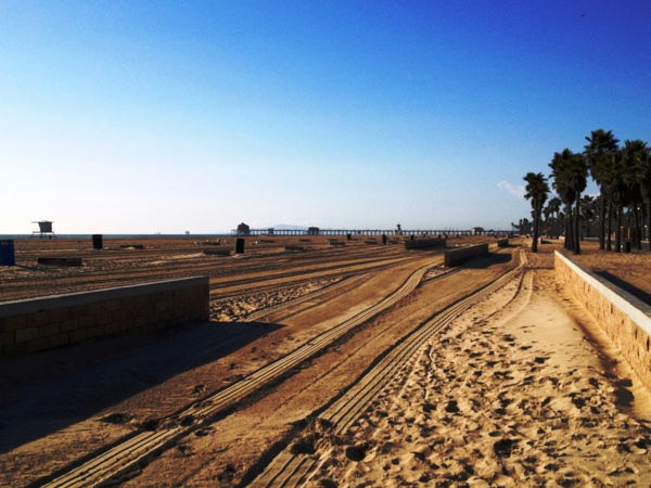 一排火坑冷清清的躺在沙灘上,人都不見了,整個城好像睡午覺去了,連衝浪人都是零星的,南歐小鎮那種午後的寂靜,怎麼也在這個太平洋邊的衝浪之城重現? 沙灘上留著一道道的汽車胎痕,靜靜的,像件與天地共享的藝術品。
