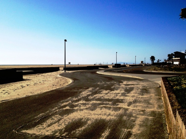 騎到此並不覺得累,是可以再前行的,但想到還要騎回去,而且是逆風,就往回騎了。 逆風行真的是累,多花了一半的時間才回到起點。已經三點多了。 這時,海灘多了些下了課的青少年騎車、衝浪、溜滑板。等到四、五點,下了班的人再來溜狗、慢跑,剛剛畫面上空白的場景,會漸漸被填滿,而且是很不歐洲的。