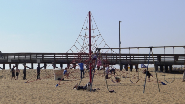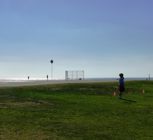 過了Newport 碼頭不久,可以看別一大片置身在沙灘上的運動塲。這裡是Newport Beach小學的所在地。這所小學早於1894年就成立,是Newport學區最久的學校,1937年遷到現在的地點。學校的運動塲就蓋在沙灘上,很難想像有這麼幸福的學生,能在這麽美的海景邊上課、嬉戲。全美只有兩所像這樣坐落在沙灘的學校,學校還提供沖浪課程供課後選修。据说學生在操塲上偶而還可以看到鲸魚出現在海面上。