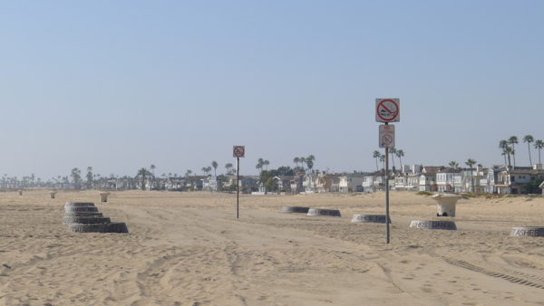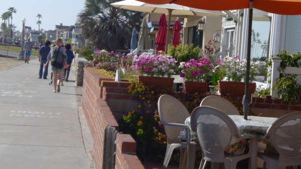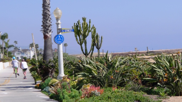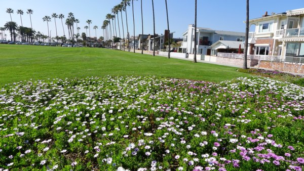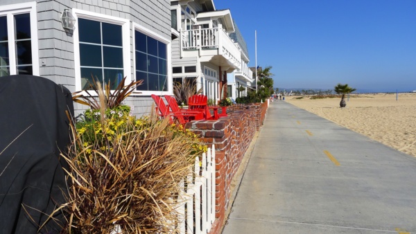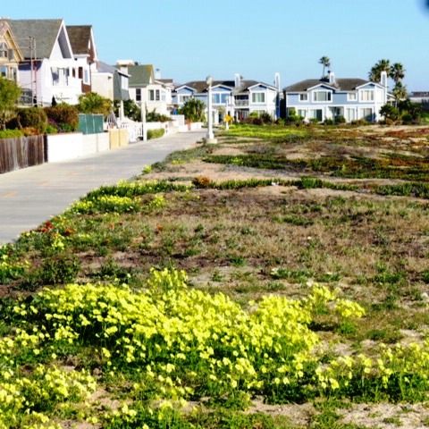 由於加卅公共碼頭海釣是免费的,不必申請執照,所以特別受釣客喜愛,但Balboa碼頭並非魚群集聚海域,所以大多是休閒式的釣客,也可見女性釣客穿插其中。 從Newport Beach 碼頭開始南行的海灘單車道,除了Balboa 碼頭附近的商業區外,整條路左貼住家、右貼沙灘一直到底,這條車道當地人稱為Newport-Balboa Boardwalk。對這裡的住戶而言,這一大片沙灘等於是自家後院,跨出陽台就是一片蔚藍海岸,得天獨厚的觀海條件,房價非比尋常,房子也蓋得各有特色,左看這些漂亮的房子,右看大片藍天大海,雖只是單騎,但所享受的美景,跟這些住戶是一樣充實的。特別的是沙灘種了不少花跟綠色景觀植物,面陽又正值初春,黃紅紫帶油綠的花圃散佈沙土上,有些地方黃色小野花遍佈,使原來單調的沙景,一下子活潑了起來。