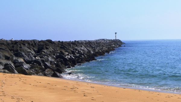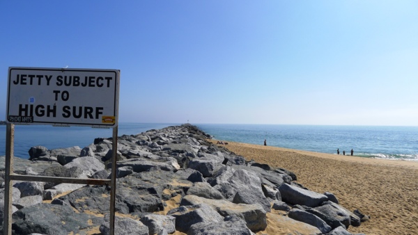 Newport 港的堤岸位於Balboa Peninsula 的尾端,也是1930年代「新政」經濟復甦方案的工程建設之一,堤岸的石塊與沙灘成九十度程垂直交會,因此被稱為The Wedge,這裡也是全球衝浪好手自我挑戰的一塊險域,當大浪來時打在堤岸,激彈起一巨波浪,這波回彈浪與下一波來襲的浪會合,激起另一波最高曾達30尺高的巨浪,由於這種特殊的險峻浪型,沒有三兩下衝浪功夫的人是不敢在這裡試身手的。堤岸邊就是Jetty View Park,風平浪靜時,少數人會在此觀看遊艇出入港灣。浪大時則會有人潮聚集在此,觀看衝浪玩家大顯身手。今天風平浪靜,看到野兔也抖膽出來覓食。