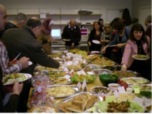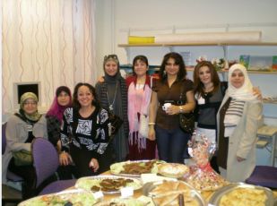 圖片是阿拉伯語的幾位同事,在她們提供的阿拉伯食物桌前。那天我們必須準備自己本國的食物,擺成一桌桌,邀請本地的各校校長、一些老師代表,和教育局官員參加我們辦公室的喬遷之喜。
