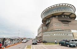 ▲桃園區漁會新大樓頂樓部分採旋轉餐廳設計,遊客可從360度欣賞港區海景。(楊宗灝攝)