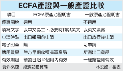 經濟部官員表示,明年元旦起,符合早收清單及特別原產地規則(PSR)的業者,可申請能適用優惠關稅的ECFA產證,其餘不適用ECFA早收清單的產品,則可申請一般產證。ECFA產證與一般產證最大不同之處是,前者以中文填寫,輔以英文;後者則以英文填寫。