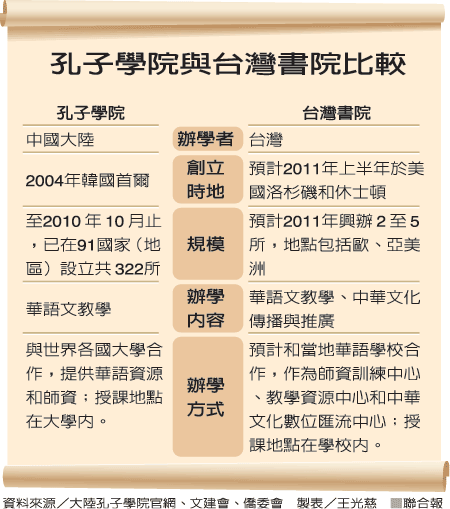 中國大陸廣設「孔子學院」,「台灣書院」在美國設立實體書院計畫卻受阻,行政院架設「全球華文網─數位台灣學院」網站,提供宋詞古唱虛擬實境教學、常用國字標準字體筆順學習網等互動課程,官員表示,網路無遠弗屆,不必和大陸銀彈競賽。