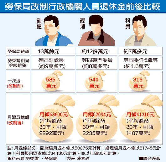 據了解,未來勞保局改制後,一律以勞保局職等減4職等掛勾行政機關職等,舉例而言,勞保局經理級為14職等,薪資12萬餘元,未來將等同勞委會10職等專門委員,但勞委會專門委員薪資只有8萬多元,勞保局經理不但不必降薪3萬多元,退休後還可以以該職等計算月退俸。