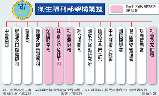 新成立的衛福部,是由原衛生署內21個單位、5個所屬機關,再加上內政部原本的社會司、兒童局、家庭暴力及性侵害防治委員會、國民年金監理會,及教育部所屬中國醫藥研究所等單位整合而成。