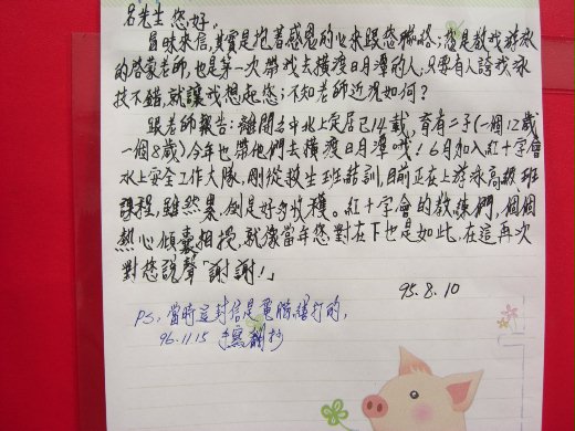 冒昧來信,其實是抱著感恩的心來跟您聯絡;您是教我游泳的啓蒙老師,也是第一次帶我去橫渡日月潭的人,只要有人誇我泳技不錯,就讓我想起您;不知老師近況如何?(我是拜託外埔的姐夫打聽您的資料的)