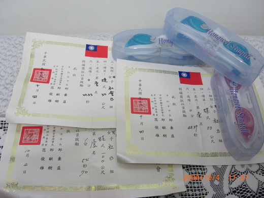 可以報名三項比賽的中和市長盃游泳比賽,嘿嘿嘿!很開心。因為有二項成績是進步的;而且這個比賽有獎品哦!