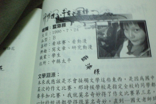 加入了好幾個文學家族、文學論壇、文學網站,我不敢說我的文章寫的是最好的,可是我交了好幾個知心的文友,這比什麼都值得。其中加入的一個文學家族中,為了要慶祝家族的生日,家長提議出一本關於自己家族的書,要我們有好文章的投稿到他那邊,由他來負責排版和印刷,不知道等了多久,那本書,真的拿到我手上了,那種心情很難以言喻,雖然不是正式的出版社的書,可是這本書卻有著大青澀的文筆,還有著溫暖的感覺。
