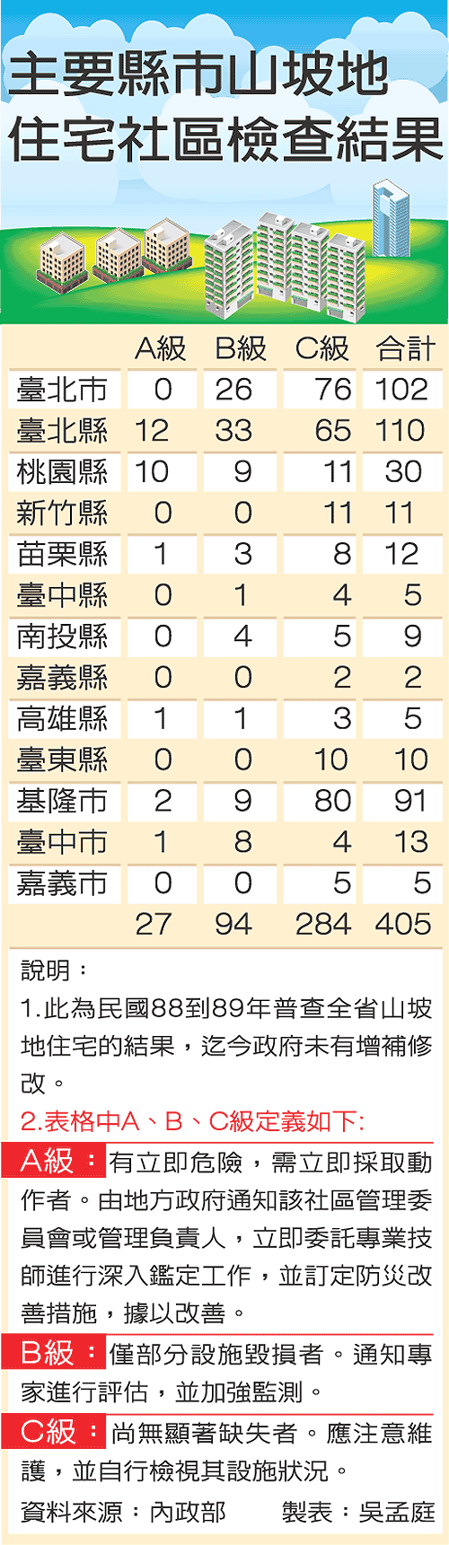 肯大郡」即因順向坡上的擋土牆被雨水沖垮,導致災害;另外, 若河床兩岸低地10年內有洪水災害紀錄,也不得開發。因此,謝 偉松建議,除了選擇1998年後核發建照的住宅外,也得注意山坡地 住宅周邊的水土保持與坡度面向,「盡量不要選擇過度開發的山 林。 」 山坡地住宅社區。北市府建築管理處主任秘書高文婷說,北市列 出135處1997年之前核發建照的山坡地住宅社區,每年請建築師、 大地技師等7大公會專業人士,檢測山坡住宅社區,並改善補強, 若有崩塌危機則立即疏散;因此,持有舊建照的山坡地住宅,目 前仍屬安全。