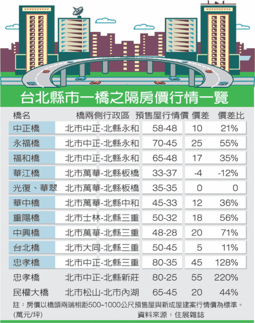 一項針對台北縣市主要連絡橋樑兩側推案價差調查顯示,除了華江、光復及華翠大橋外,同一橋樑,北縣端多比北市端便宜2~7成,甚至只有一半或3分之1的價格。