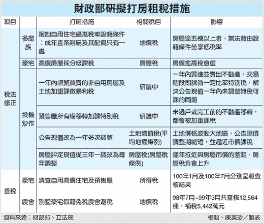 改善所得分配惡化趨勢,財政部擬多管齊下,將以租稅手段抑制不動產漲價利得歸私,財政部長李述德今(9)日將提出包括:限制多屋族利用人頭設籍坐享輕率、高價房屋分級課房屋稅,一年內移轉非自用住宅加重課稅等多項房地產加稅計畫。