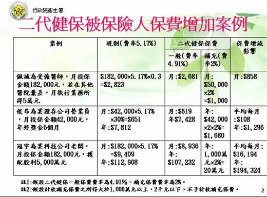 立法院三讀通過健保法修正案,對額外收入者增收補充保險費,包括股利、利息、兼職所得、租金、執行業務所得及高額獎金收入,前五筆只要單筆逾兩千元,以及全年累計超過四個月的年終獎金或績效獎金,都必須按費率百分之二扣繳補充健保費。