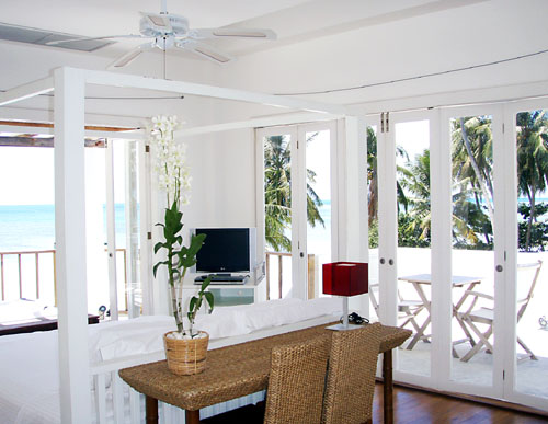 這裡的房間內部一樣走白色及簡約路線,不算大,但是很舒適。我住在二樓的客房,有個廻廊式陽台,視野很好,可以看海看得很遠,也可以覽盡整個旅店花園景觀。但是最令我念念不忘的則是浴室!純白的主軸,配上高雅的白色蝴蝶蘭,還有圓型玻璃的洗臉盆及大大的鏡子,非常的聖潔、高雅。此外,乾、溼分離的衛浴設備,在浴缸的上方還有天窗,陽光可以直接灑下來,很是美麗,在這裡泡澡,會有不想起身的貪念。