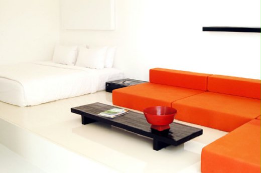 房間內部是標準的極簡禪風,全白的牆、床,搭上高級黑色桌椅及木板地,唯一有顏色的地方是長方型的沙發墊及牆上大正方型的「燈箱」!由於主人相信色彩可以主導一個人的心情,但又考慮到每個人及每天均有不同,於是設計這個燈箱,配上了5種色彩,住客可以選擇適合自己的色彩,或是讓它像跑馬燈般不停的變化著。