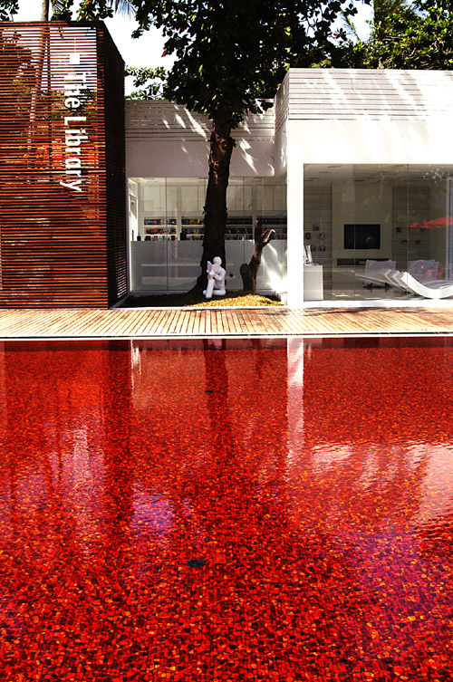 這家旅店的主人很年輕,不到30歲,從小在旅館業長大,當自己可以手握主導權時,第一件事就是要蓋一間充滿創意而且很別緻的旅店。他告訴我,創意無論如何天馬行空,最終還是要回到生活層面上,因為長年看見歐美的遊客總是手握一本書,或在泳池畔、或在海灘及椰樹下,悠哉的消磨一下午的時光,於是創意便從遊客手上的那本「書」開始,進而想到裝書的「箱子」,也就是方型房間設計的緣由,最後再把箱子放在一個大主體內,於是「圖書館」精品旅店就這樣誕生了!很是有趣,也創意十足!