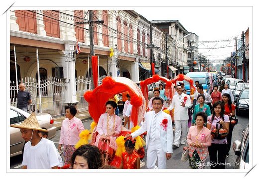 泰國觀光局刻意選在2月14日西洋情人節的這一天,在普吉島的普吉城老街,舉行了這一場「兩島一文化,閩南傳統婚禮」,原以是只是一般的結婚慶典活動,卻沒想到場面之隆重盛大,令我著實嚇了一跳!不但普吉城的老街封街遊行慶祝,還有號角樂隊、耍旗隊、舞獅隊及各式表演團體等,並出動了人力花車,且由普吉島省長親自領軍,帶著我們的白馬新郎們,浩浩盪盪的迎親去。只見來自台灣及泰國的數十位新聞記者不斷的來回穿梭隊伍搶拍畫面,而花車上的新郎們,及兩旁夾道的民眾們亦紛紛舉起相機你拍我、我拍你,好不熱鬧!