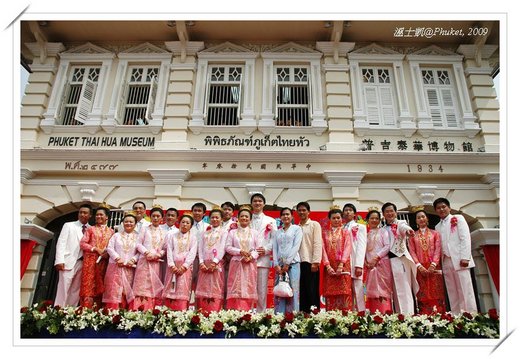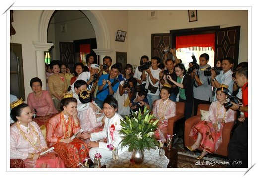 對了,特別值得一提的是,為了這場婚禮盛宴,所有的普吉島華僑們幾乎總動員,而一些貴婦們,為了扮演這8對新人的乾媽角色,不但巧裝打扮,甚至把家傳珠寶都配戴上身,非常之慎重。我記得一位乾媽緊握著新人們的手並開心的跟我說:「我今天非常開心,不但收了一對台灣的乾兒女,還幫他們辦喜事,真是好開心啊!」媽媽的率真可愛,讓我的心浮上了一股暖暖的幸福滋味,而那一瞬間,我彷彿在新人的眼中,也看見了………。