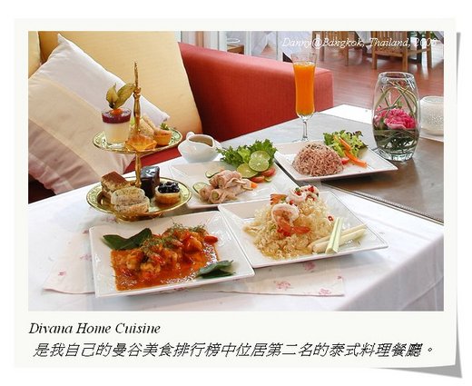 2008年他們告訴我他們在蘇坤蔚35巷的Divana Nurture Spa館加設了泰式料理及英式下午茶,我很好奇的飛到曼谷去嚐他們的料理,結果驚為天人,很訝異他們竟然有如此棒的手藝,而且搭配白屋庭院、百年大樹及英倫風情,說有多詩意夢幻,就有多詩意夢幻!