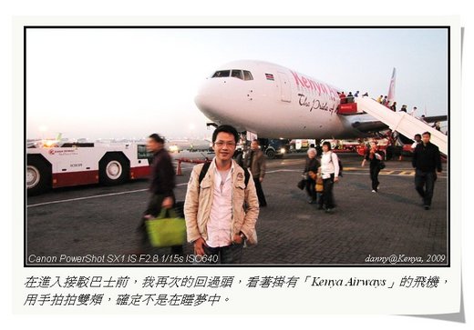 而就在進入接駁巴士前,我再次的回過頭,看著掛有「Kenya Airways」的飛機,用手拍拍雙頰,確定不是在睡夢中,才帶著微揚的嘴角,用極興奮的心,小聲的喊著:「肯亞,我來了!」再跳上接駁巴士離去。