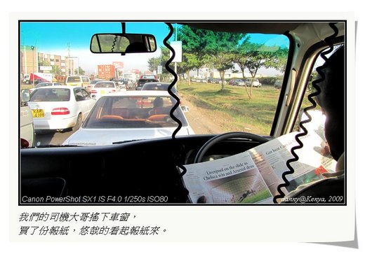 不一會兒,車陣中冒出了一些小販,拿著各式商品及報紙穿梭車陣中販售,只見我們的司機大哥搖下車窗,買了份報紙,悠哉的看起報紙來,領隊Cliff則利用這個機會,開始跟我們聊了肯亞的基本概況,也順便告訴我們:「首府奈洛比的塞車非常有名,我們不用急。疲憊的,可以趁機休息一下,因為這一塞,大半個小時是跑不掉的!」