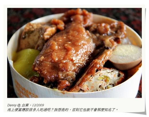 其實吃便當對我而言,也沒有什麼特別的喜惡,只要不算太差,我還是會本著客家人的美德,乖乖的、無怨尤的把它吃完。只是最近連著幾回在高鐵上享用高鐵便當或是台鐵便當時,每每剛把飯菜一口送進嘴裡,我便不由自主的停了下來,斜著頭,鼻子重重的呼了一口氣出來,腦海裡則同時出現了一個令人想念的畫面,而且在想的同時,還伴隨著一股很想吃的美妙米香滋味在舌尖打轉,那就是台東的「池上便當!」