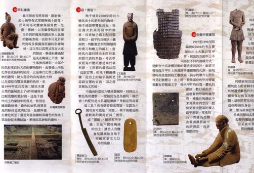 這次的展出有如同真人大小般的將軍俑、跪射俑、武士俑、文官俑、騎兵俑、百戲俑、青銅仙鶴……等等,最令人驚艷的是最新發掘出來的彩繪俑(綠面和彩色跪射俑),據說彩俑平時到西安歷史博物館去也看不到喔!除此之外,還展出秦代出土的貨幣、青銅器、陶製食器、地磚、瓦當、玉器、予、鏃、弩機等,以及十五分鐘的影片介紹。