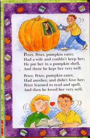 前幾天,在任職的托兒所內自己所設計的萬聖節活動中,根據自己設計的教案要教小朋友唸一首應景的童謠。於是,我上網搜尋國外幼兒教學所有的教案資料,這首"Peter Peter Pumking Eater"是最常在萬聖節時被用在教學上的。正好我有一套Ladybird所出版的童謠系列,其中一本裡就有這首童謠(如上圖),可以讓我拿來運用。