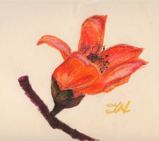 今正值木棉花開之時,看到路旁盛開豔麗、具有旺盛生命力的木棉花,我的手又不自覺的「癢」了起來。趁午後一時興起,隨手抓了蠟筆,就這樣歡歡喜喜的完成了這幅「木棉花」。