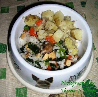 菜單:白飯小半碗、牛蒡與茄子各一小段、豆乾兩三塊、紅蘿蔔四分之ㄧ根、香菇一兩朵、油菜梗一小段、油菜葉兩片,馬鈴薯一顆、牛奶一杯,蒜蓉、巴西里少許,兩粒犬貓專用啤酒酵母。