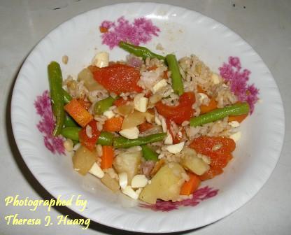 今天下班得較早,又有時間幫福福做晚餐了。想做西式口味的,於是想出這樣的菜色,馬鈴薯、紅蘿蔔、白蘿蔔、蕃茄、四季豆,然後在飯上灑上一條切碎的起司條。