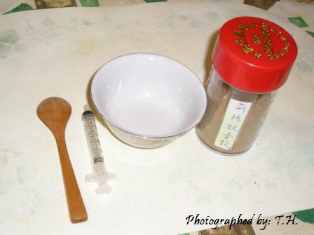 PS1. 我的調藥方法:用非常少許的藥粉放入小碗裡,加入少許的冷開水,用湯匙調勻後,拿針筒將要吸入針筒內,約用2至4CC的冷開水即可。