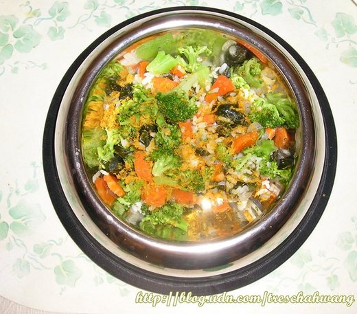 另外,再川燙福福愛吃的綠花椰菜,就成為這頓豐盛的晚餐。把所有菜肴和白飯放進他的不鏽鋼碗,等飯菜不那麼燙了,再在其上灑上最近發現好吃又營養的素南瓜鬆(上圖右)。我和他就這樣吃著一樣的食物,只是我的菜比他的鹹些。