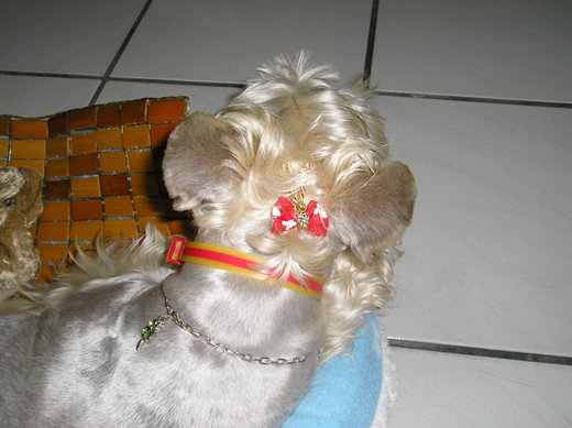 這是後來的造型,毛髮稍長了,寵物美容師在我的要求下綁頭髮,剛開始的時候,她只是用橡皮筋綁了一撮頭髮。從後面看起來,很像在腦後方開了一朵小花。
