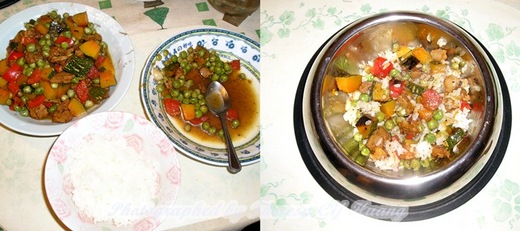 事實上,主要我是想以豆子來做墩素肉。我利用了數日前在餐廳用餐時點了並未食用完的桔汁素雞塊,以及冰箱裡幾樣尚未用完的蔬菜,再妥善運用蔬菜本身的色澤,於是做出這道色香味俱全的墩素肉。