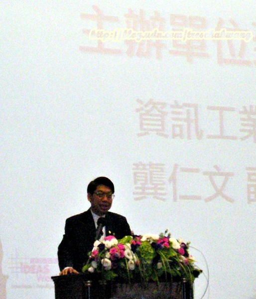 來到會場後才恍然大悟,這個活動原來和經濟部商業局有關(見底圖上),他們與資策會共同主辦了三屆的「2010 IDEA SHOW」(網路創意展)以及首屆的「IDEAS EXPO」(IDEA博覽會)。資策會副龔副執行長仁文在致詞時表示(見底圖下),大意是說,這是個網路創意的時代,每個部落客就像是個小型媒體人,資訊交換迅速甚至比電子或平面媒體還更快、更準確,或更客觀,是不容忽視的一個力量。
